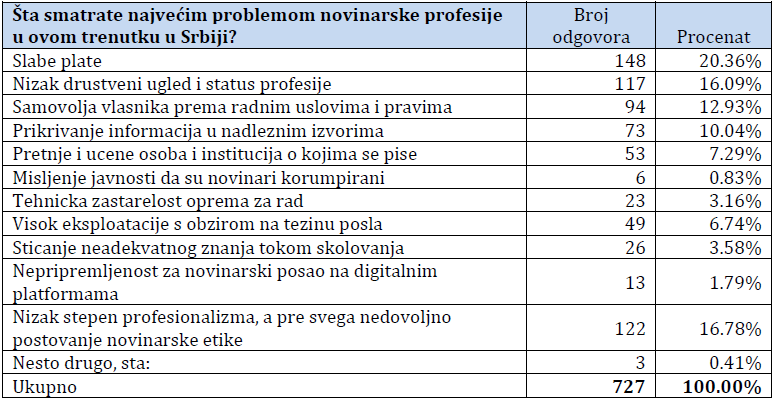 Odgovor sa najvećim brojem glasova jeste slabe plate, a zatim i nizak ugled profesije, kao i nepoštovanje novinarske etike. Međutim, ovde se nameće jedna uzročno – posledična veza: kako očekivati ugled, ukoliko ne postoji poštovanje etičkih principa na kojima bi zapravo trebalo utemeljiti novinarsku profesiju?!