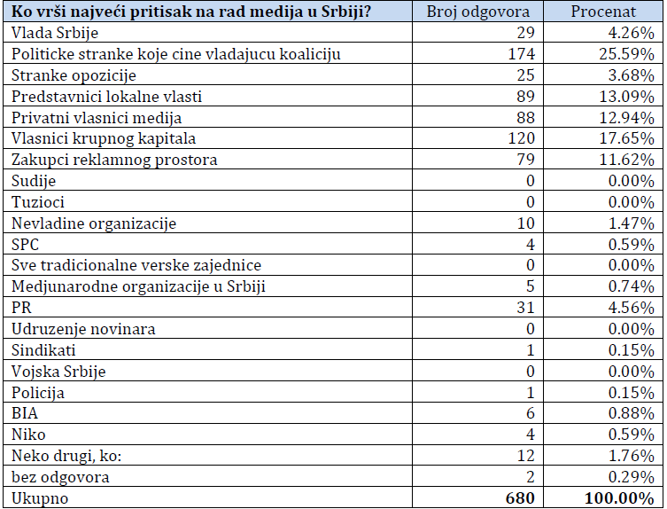 Ovde vidimo jedan paradoks koji kaže da najveći pritisak vrše stranke vladajuće koalicije, a znatno manje Vlada. Međutim, u Vladi su upravo te stranke. Gotovo 30% vršioca pritiska na medije čini vlast. A zatim i vlasnici krupnog kapitala, koji su često i sami političari, koji na direktan ili indirektan način mogu da utiču na uređivačku politiku.