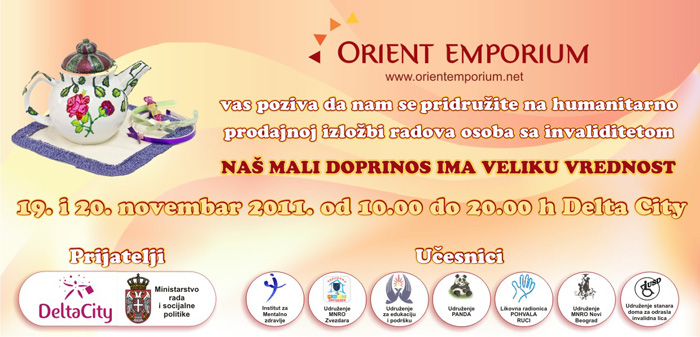 Akcija će trajati 17. i 18. maja od 10 do 20 časova. Ovaj događaj organizuje ORIENT EMPORIUM u saradnji sa Institutom za mentalno zdravlje Palmotićeva i udruženjima koja pružaju pomoć osobama sa invaliditetom i problemima mentalnog zdravlja (MNRO Zvezdara, MNRO Novi Beograd, MNRO Pančevo, Udruženje Panda, Udruženje stanari doma sa telesnim invaliditetom, Dom Sremčica, Udruženje Ide i Udruženje Talos) uz podršku TC Delta City. Humanitarno-prodajna izložba „Naš mali doprinos ima veliku vrednost” se organizuje sa ciljem da se javnost upozna sa radom ovih udruženja, da pokaže kako mali doprinos za ove osobe ima veliku vrednost. Kupovinom proizvoda posetioci će biti u situaciji da pomognu udruženjima u prikupljanju novčanih sredstava za obavljanje različitih društvenih aktivnosti , a na taj način se u samim učesnicima budi jak motiv ka socijalizaciji i ozdravljenju, kao i osećaj pripadnosti društvu. Radovi su stvarani na svakodnevnoj radnoj terapiji u okviru kreativne radionice.