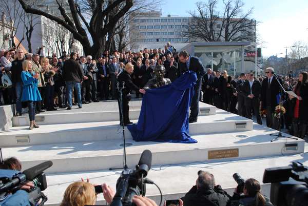 Spomenik književniku Borislavu Pekiću otkriven je juče, 2. marta, na Cvetnom trgu u Beogradu.