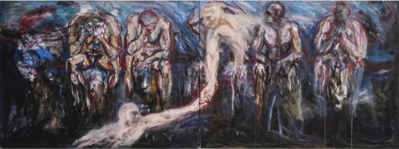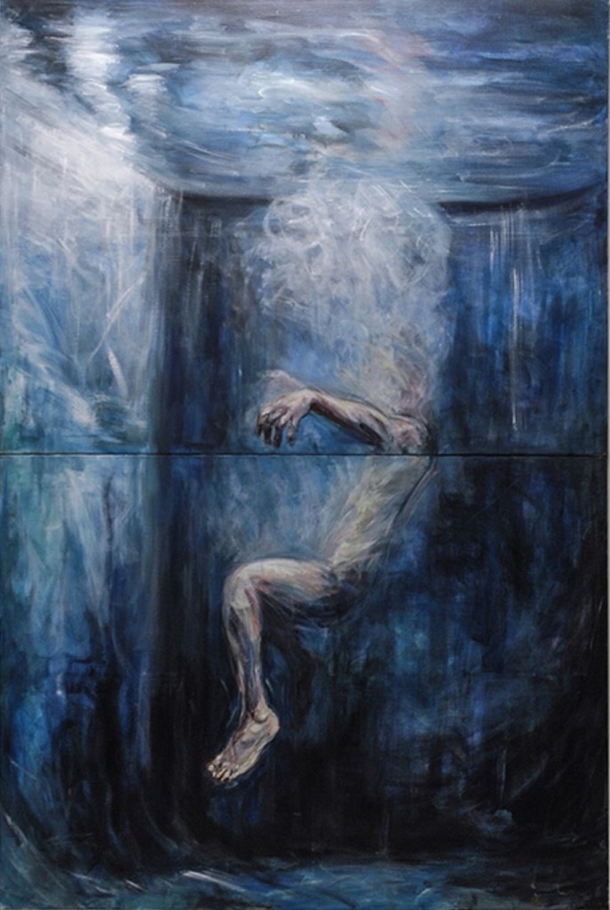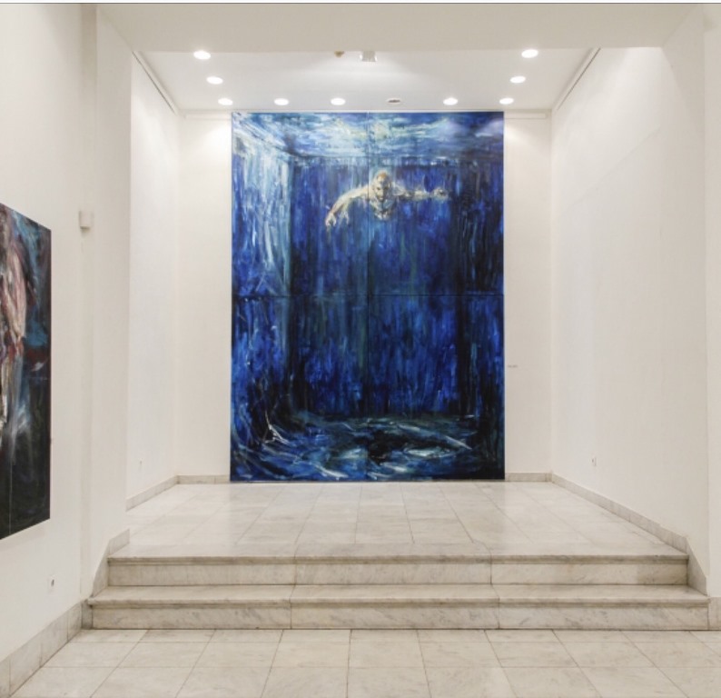 Vaše slike su velikih razmera i, samim tim, iz više delova. Posebnu pažnju mi je privukla slika vaterpoliste-ronioca koja je prekrila jedan ceo zid u ULUS-u. Koliko vremena Vam je bilo potrebno da je naslikate?