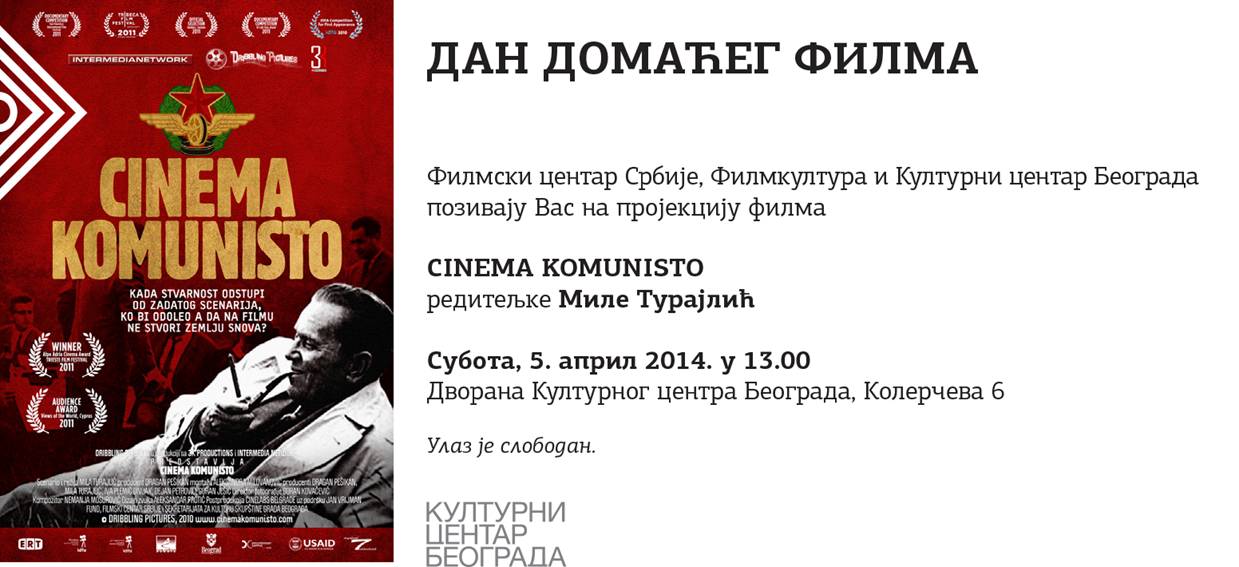 - Film “Cinema Komunisto” biće prikazan u Kulturnom centru Beograda, sa početkom u 13 časova. Projekcija se održava u okviru Dana domaćeg filma, inicijative koju je pokrenuo Filmski centar Srbije u saradnji sa Filmkulturom, organizacijom posvećenom edukaciji u oblasti audiovizuelne kulture i umetnosti, koja za cilj ima obrazovanje i stimulaciju kritičkog mišljenja.