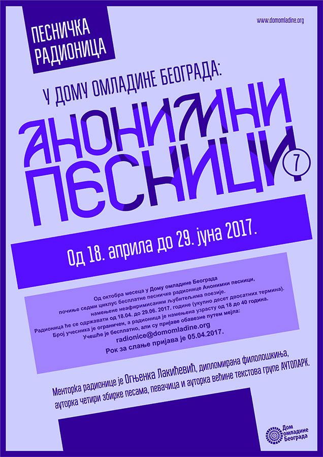 Ovo je sedmi po redu ciklus besplatne pesničke. Radionica je organizovana u ukupno deset dvosatnih termina. Broj učesnika je ograničen, a radionica je namenjena uzrastu od 18 do 40 godina. Učešće je besplatno, ali su prijave obavezne putem mejla: radionice@domomladine.org. Rok za slanje prijava je 05.04.2017.