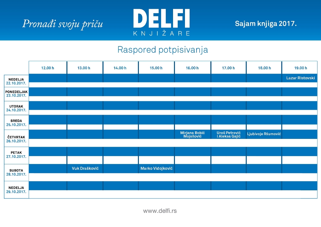 Na štandu Delfi knjižara tokom Sajma važiće i popust od 15% prilikom kupovine do 4 knjige, popust od 20% prilikom kupovine 5–8 knjiga i popust od 25% prilikom kupovine 9 i više knjiga. Ukoliko posetite Delfi štand sa flajerom sa Laguninog štanda, na ove popuste imaćete i dodatnih 5% popusta. Ovi popusti važiće za sve knjige, osim za one koje su na akcijama kao i za Lagunine naslove na koje ne ide popust. Poseban popust od 50% pa čak do 75% važiće za knjige u izdanju Paideje, Stubova kulture i Profila. Disney knjige izdavača Sun Promo biće snižene za 50%. Za odabranih 100 Laguninih naslova važiće popust od čak 50% dok će pojedine knjige na engleskom biti snižene za 50% i 75%, a spremili smo i akciju „5 za 999“.
