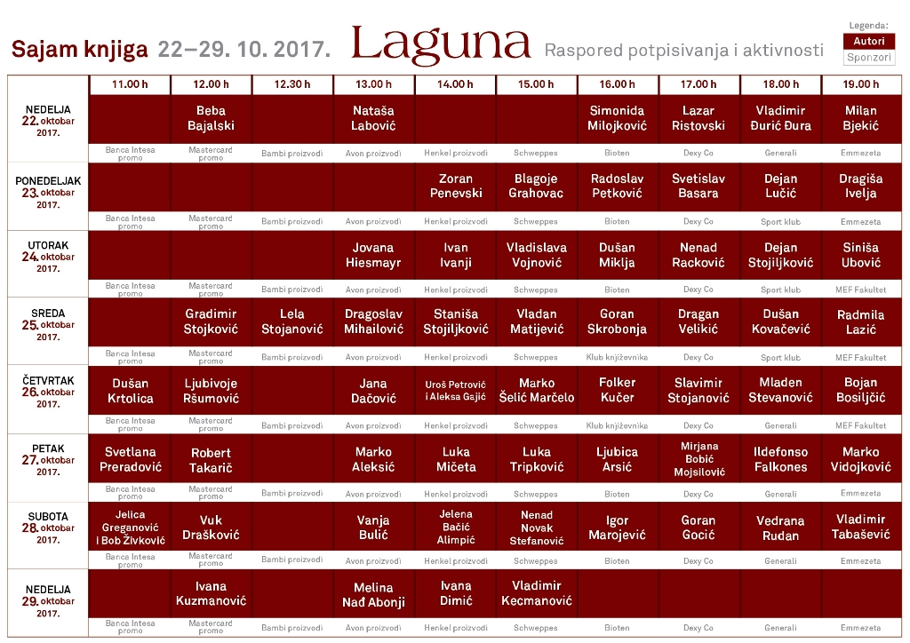 Jedan od razloga zašto čitaoci vole Sajam knjiga jeste i mogućnost da se sretnu sa svojim omiljenim piscima. Na štandu Lagune u Hali 1 svoje knjige potpisivaće Ildefonso Falkones, Vedrana Rudan, Dragoslav Mihailović, Svetislav Basara, Dragan Velikić, Radoslav Petković, Vladan Matijević, Folker Kučer, Vladimir Kecmanović, Dejan Stojiljković, Jelena Bačić Alimpić, Mirjana Bobić Mojsilović, Marko Šelić Marčelo, Gradimir Stojković, Robert Takarič, Slavimir Stojanović i mnogi drugi pisci.