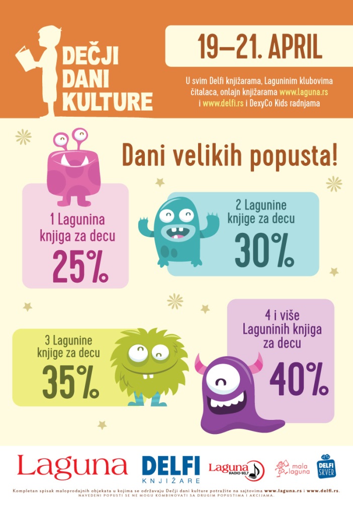 U svim knjižarama Delfi i Laguninim klubovima čitalaca koji se nalaze u Beogradu, Nišu i u još 20 gradova u Srbiji važiće veliki popusti na knjige za decu i mlade, dok će u knjižari u SKC-u, Dečjem kulturnom centru i u prodavnici Dexy Co u TC Ušće biti organizovan raznovrstan program. Vaše je samo da napravite svoj raspored.