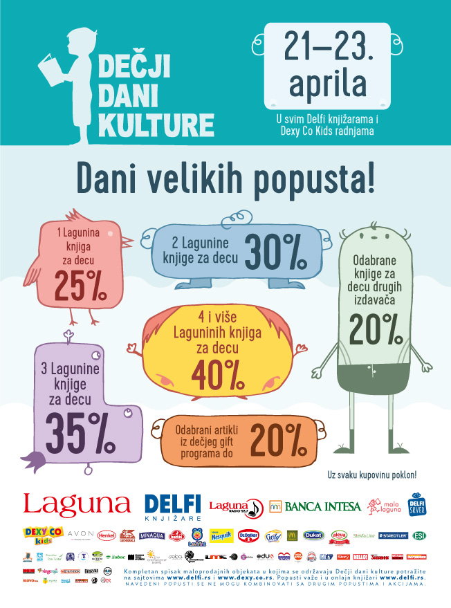Prema saopštenju organizaotra, popusti na Lagunina izdanja za jednu dečju knjigu iznosiće 25%, za dve 30%, za tri 35%, a za četiri i više knjiga za decu 40%. Isti popusti važi će i na izabrane Disney i Littlest Pet Shop knjige. Kako u Dečjim danima kulture učestvuju i drugi izdavači, popusti na njihove naslove biće 20%. U knjižarama Delfi očekuju vas popusti od 15% na LEGO i do 20% na ostale Dexy Co igračke kao i dečji gift program drugih dobavljača. Uz svaku kupovinu spremili smo i poklone!