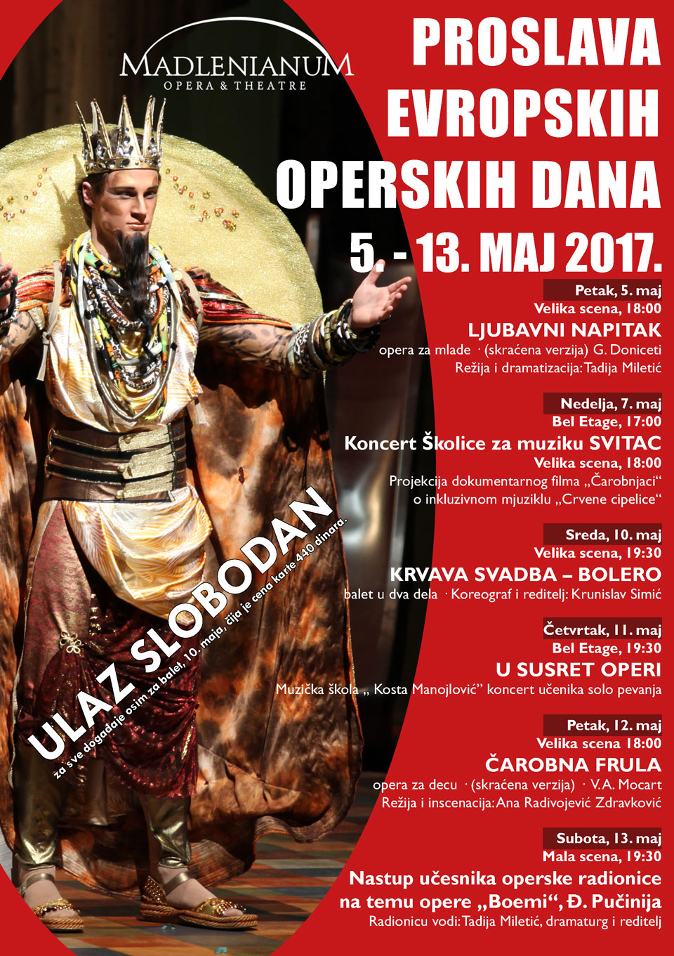 Posetioci će imati priliku da uživaju u dva operska naslova – Ljubavni napitak (5.maj) i Čarobna frula (12. maj), koji su deo programa za mlade Opere i teatra Madlenianum, i za čija izvođenja su ulaznice besplatne!
