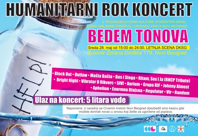Humanitarni rok koncert „Bedem tonova“ će se održati u sredu 28. maja od 15h do 24h na Letnjoj sceni Doma kulture Studentski grad, a ulaz na koncert iznosi 5 litara flaširane negazirane vode. Takođe, posetioci će imati priliku i da doniraju novac za ugrožene od poplava, tako što će iznos po želji ubaciti u zapečaćenu kasicu Crvenog krsta.