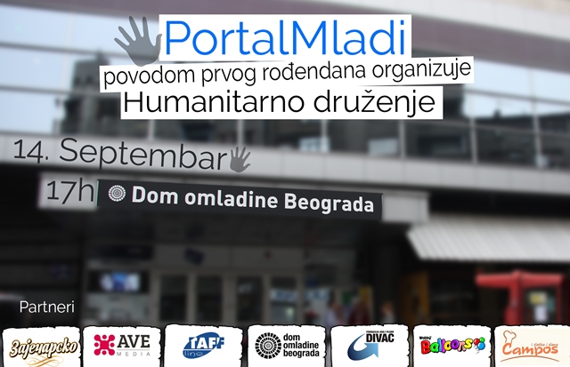 Humanitarno druženje povodom prvog rođendana sajta PortalMladi.com održaće se u nedelju, 14. septembra ove godine u holu Doma omladine u Beogradu. Događaj je otvorenog tipa i planirano je da traje u periodu od 17:00 do 22:00 časova.