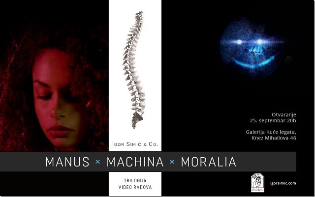 Trilogija video radova Manus x Machina x Moralia Igora Simića biće otvorena 25. septembra u 20h u Galeriji Kuće legata, u Ulici Kneza Mihaila 46 u Beogradu.