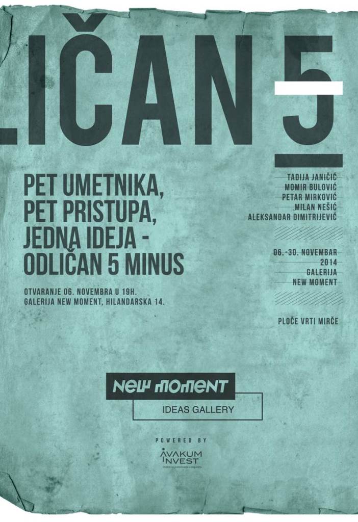 Izložba „Odličan 5-“, koju čine dela Petra Mirkovića, Tadije Janičića, Aleksandra Dimitrijevića, Milana Nešića i Momira Bulovića, biće predstavljena od 6. do 30. novembra u Galeriji New Moment u Beogradu.