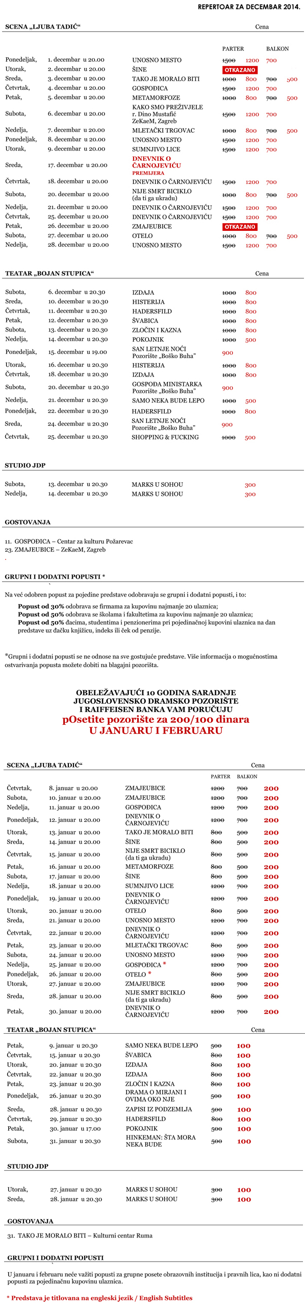 Jugoslovensko dramsko pozorište pokrenulo je veliku zimsku akciju za sve ljubitelje teatra, koji će tokom januara i februara karte za predstave moći da kupe po cenama od 100 i 200 dinara.