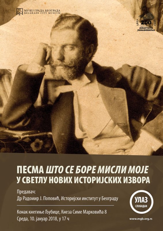 Predavanje „Pesma Što se bore misli moje u svetlu novih istorijskih izvora“, dr Radomira J. Popovića, biće održano 10. januara u 17h u Konaku kneginje Ljubice u Beogradu.