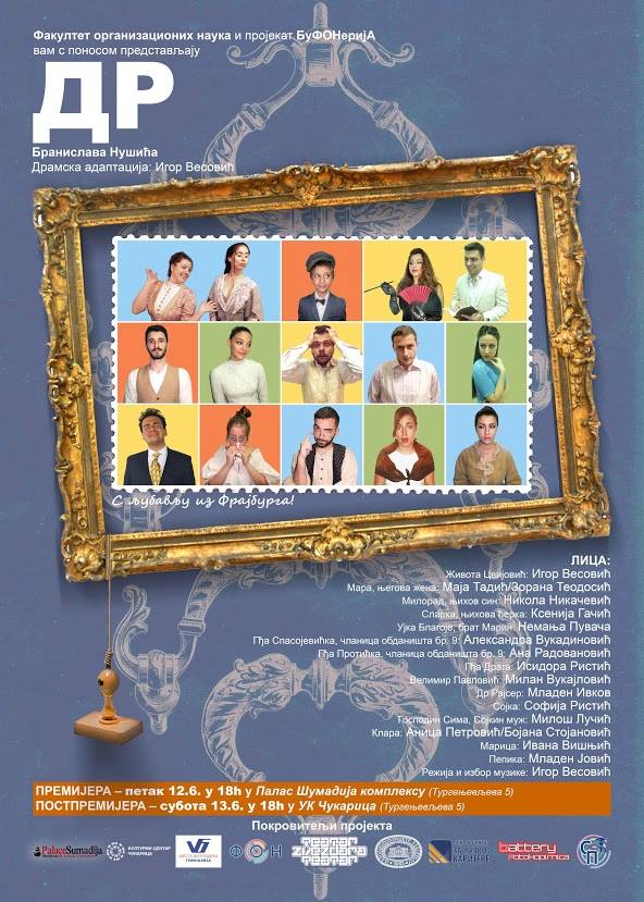 Premijera predstave „DR“ Fakulteta organizacionih nauka i projekta #BuFONerija, a po tekstu Branislava Nušića, održaće se 12. juna u 18 časova u Palace Šumadija kompleksu u Turgenjevljevoj 5 u Beogradu.