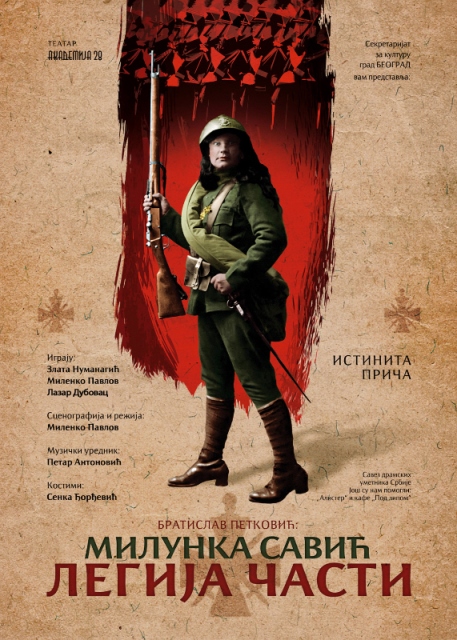 Premijera predstave „Legija časti – Milunka Savić”, po tekstu Bratislava Petkovića, održaće se 28. januara u 20 časova na Sceni Akademije 28 u Beogradu.