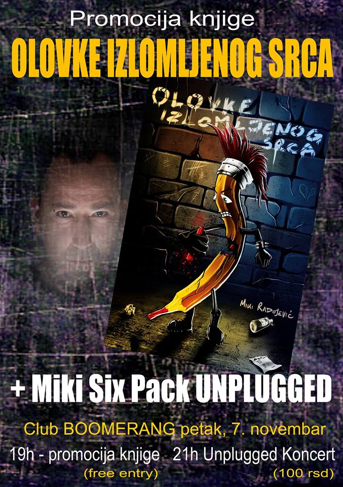 Promocija knjige frontmena grupa Six Pack i Čovek bez sluha, Mikija Radojevića, pod nazivom Olovke izlomljenog srca održava se u petak 7. novembra u Pabu Boomerang (Zmaj Jovina 14, u pasažu) u 19 časova.