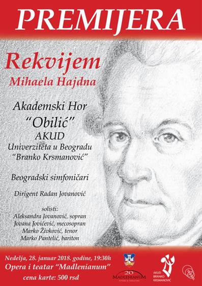 Premijera „Rekvijema u C molu” Mihaela Hajdna, a u izvedbi Akademskog hora „Obilić” AKUD Univerziteta u Beogradu „Branko Krsmanović“ i orkestra „Beogradski simfoničari”, biće održana 28. januara na sceni Opere i teatra Madlenianum.