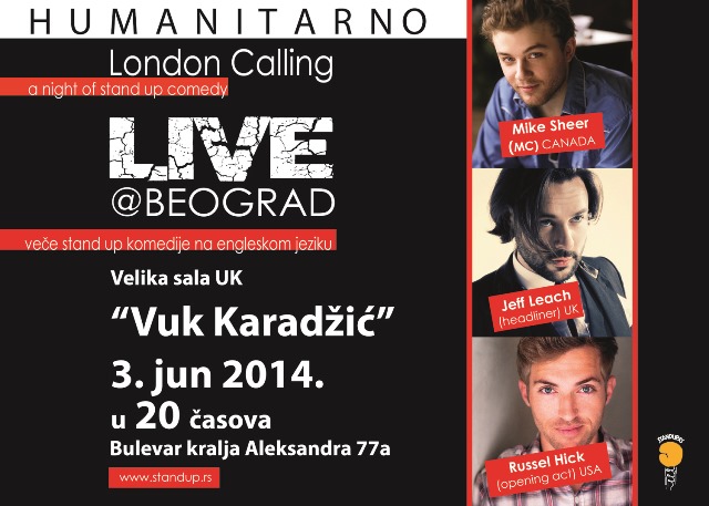 Saradnja London calling i Standup.rs traje već tri godine, i ova ekipa je dovodila Eddie Izzarda i Dylana Morana u Beograd, a sada će Jeff Leach, Russell Hicks i Mike Sheer po prvi put nastupiti u Srbiji i svoje honorare dati u dobrotvorne svrhe.
