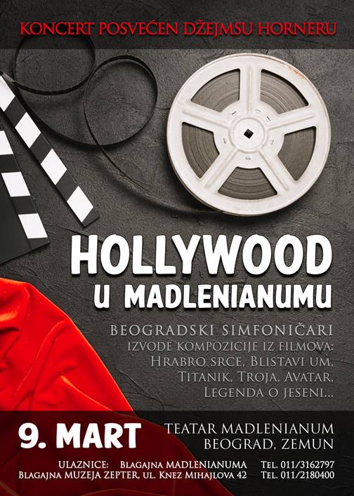 Koncert HOLLYWOOD U MADLENIANUMU, kroz koji će nas voditi Beogradski simfoničari, a na krilima filmske muzike čuvenog kompozitora Džejmsa Hornera, biće održan 9. marta, u 19:30h, u Operi i teatru Madlenianum u Zemunu.