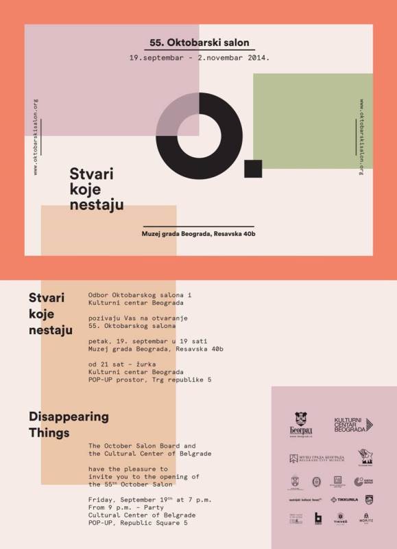 Ovogodišnji 55. Oktobarski salon pod nazivom Stvari koje nestaju održava se od 19. septembra do 2. novembra u Muzeju grada Beograda u Resavskoj ulici 40b. Salon predstavlja radove 32 umetnika iz zemlje i inostranstva i otvara se večeras u 19 časova.
