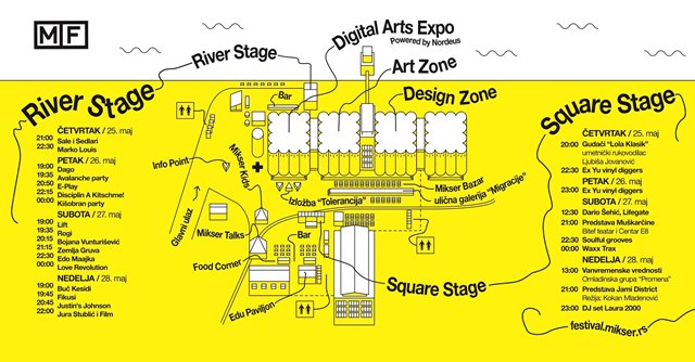 Prema zvaničnom saopštenju organizatora, svi obrazovni i izložbeni programi Mikser festivala su, kao i uvek BESPLATNI TOKOM ČITAVOG FESTIVALA. Istražite izložbe dizajna, umetnosti, digitalnih tehnologija u magičnim silosima, slušajte pametne Mikser i Nordeus razgovore, učestvujte u kreativnim i obrazovnim radionicama, dovedete klince da maštaju u Mikser Kids&Teen zoni, uživajte u reci, pogledu, gigantskim projekcijama, druženju. Ulaznice postoje SAMO ZA VEČERNJI MUZIČKI PROGRAM NA RIVER BINI, i to tri od četiri festivalska dana (petak, subota i nedelja) dok su svi ostali muzički programi na festivalu, takođe besplatni, uključujući i program na glavnoj RIVER bini u četvrtak 25. maja.